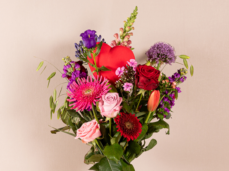 Warm en hip roze/lila/rood plukboeket bloemen met hartsteker.