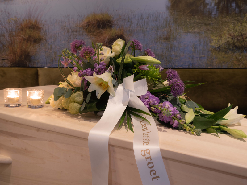 Rouwarrangement dat als bloemstuk op water is gestoken om bij een overledene te plaatsen op of bij de kist. Stuk is meestal een aantal dagen houdbaar. Getoonde formaat is middel.